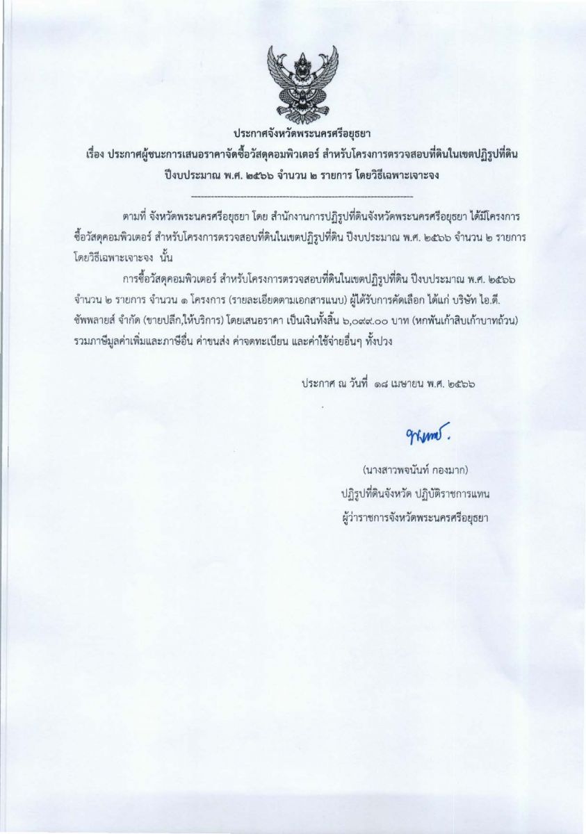 ประกาศจังหวัดพระนครศรีอยุธยา เรื่อง ประกาศผู้ชนะการเสนอราคาจัดซื้อวัสดุคอมพิวเตอร์ สำหรับโครงการตรวจสอบที่ดินในเขตปฏิรูปที่ดิน ปีงบประมาณ พ.ศ. 2566 จำนวน 2 รายการ โดยวิธีเฉพาะเจาะจง