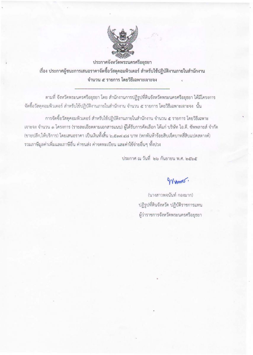 ประกาศจังหวัดพระนครศรีอยุธยา เรื่อง ประกาศผู้ชนะการเสนอราคาจัดซื้อวัสดุคอมพิวเตอร์ สำหรับใช้ปฏิบัติงานภายในสำนักงาน จำนวน 5 รายการ โดยวิธีเฉพาะเจาะจง