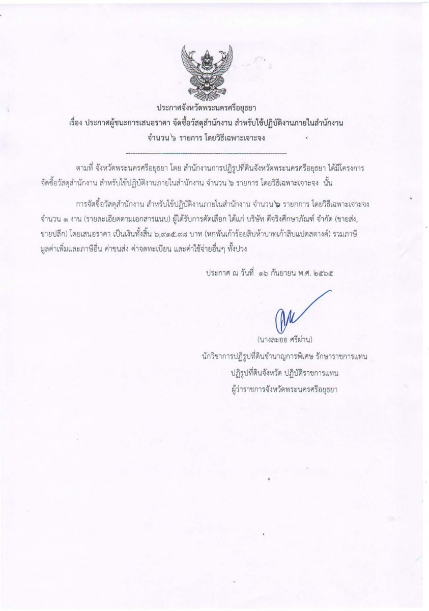 ประกาศจังหวัดพระนครศรีอยุธยา เรื่อง ประกาศผู้ชนะการเสนอราคาจัดซื้อวัสดุสำนักงาน สำหรับใช้ปฏิบัติงานภายในสำนักงาน จำนวน ๗ รายการ โดยวิธีเฉพาะเจาะจง