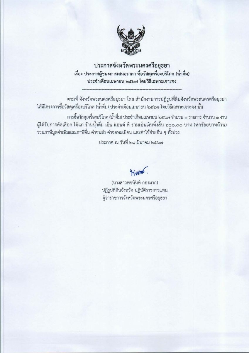ประกาศจังหวัดพระนครศรีอยุธยา เรื่อง ประกาศผู้ชนะการเสนอราคาจัดซื้อวัสดุเครื่องบริโภค (น้ำดื่ม) ประจำเดือนเมษายน ๒๕๖๗ โดยวิธีเฉพาะเจาะจง