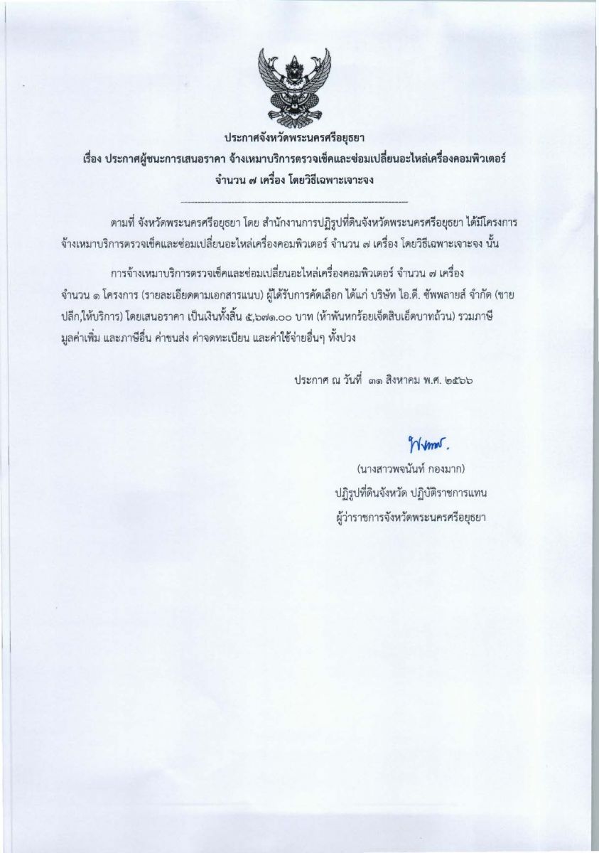 ประกาศจังหวัดพระนครศรีอยุธยา เรื่อง ประกาศผู้ชนะการเสนอราคาจ้างเหมาบริการตรวจเช็คและซ่อมเปลี่ยนอะไหล่เครื่องคอมพิวเตอร์ จำนวน 7 เครื่อง โดยวิธีเฉพาะเจาะจง