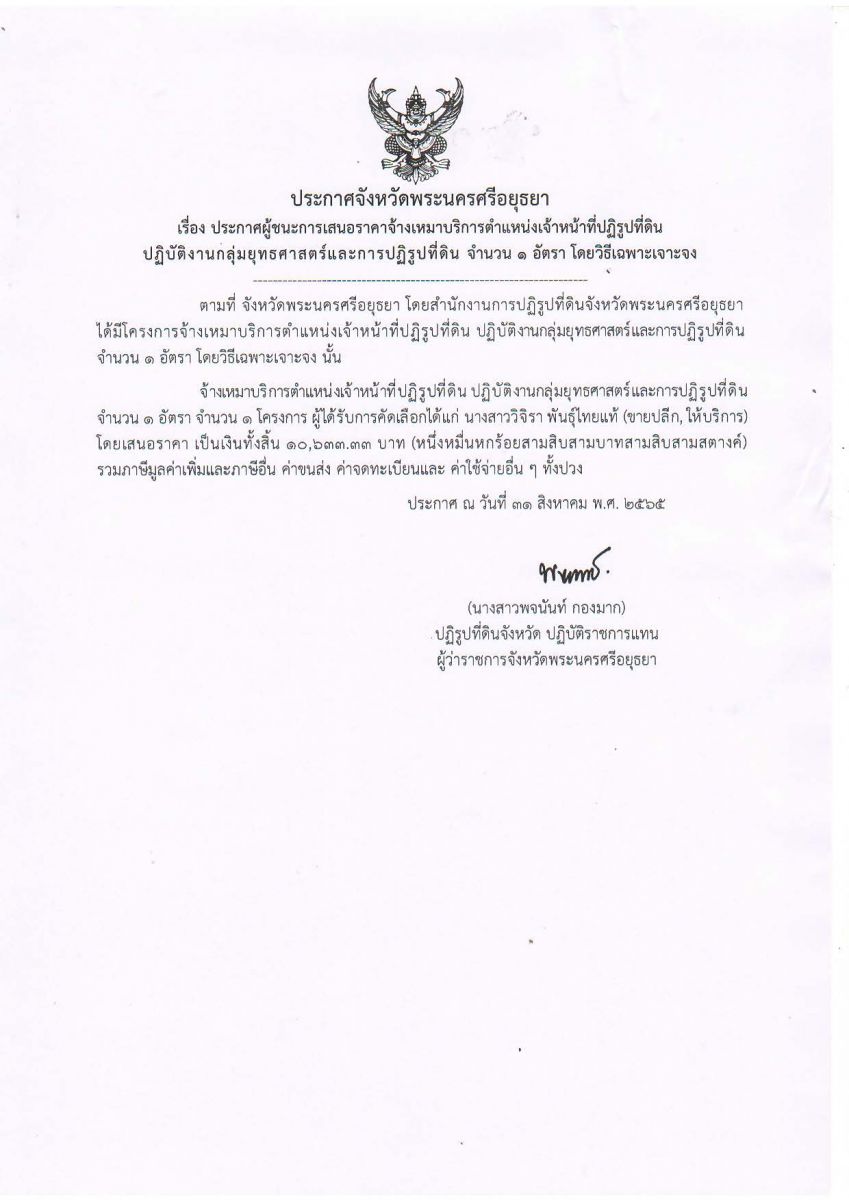 ประกาศจังหวัดพระนครศรีอยุธยา เรื่อง ประกาศผู้ชนะการเสนอราคาจ้างเหมาบริการตำแหน่งเจ้าหน้าที่ปฏิรูปที่ดินปฏิบัติงานกลุ่มยุทธศาสตร์และการปฏิรูปที่ดิน จำนวน 1 อัตรา โดยวิธีเฉพาะเจาะจง