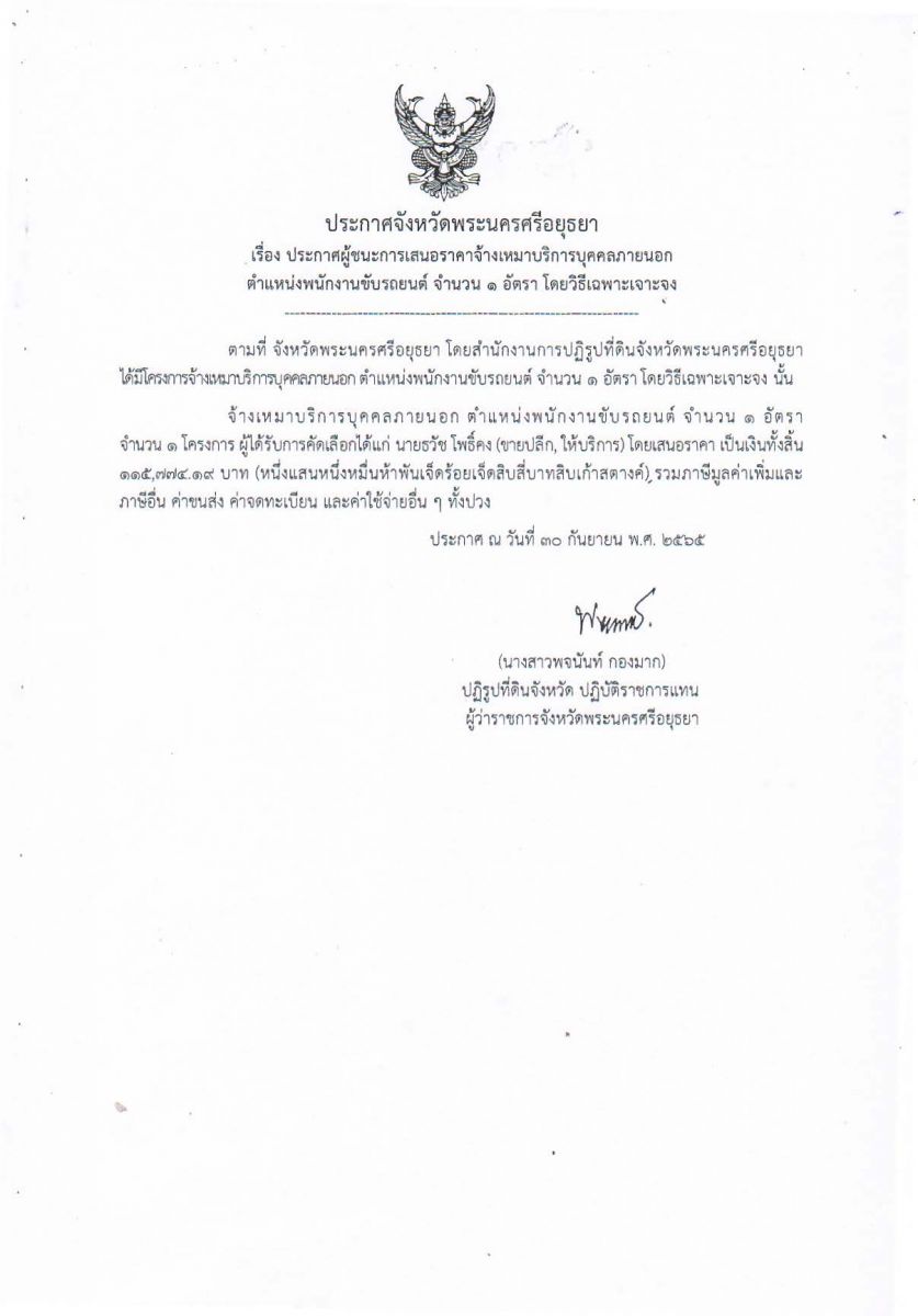 ประกาศจังหวัดพระนครศรีอยุธยา เรื่อง ประกาศผู้ชนะการเสนอราคาจ้างเหมาบริการบุคคลภายนอกตำแหน่งพนักงานขับรถยนต์ จำนวน 1 อัตรา โดยวิธีเฉพาะเจาะจง
