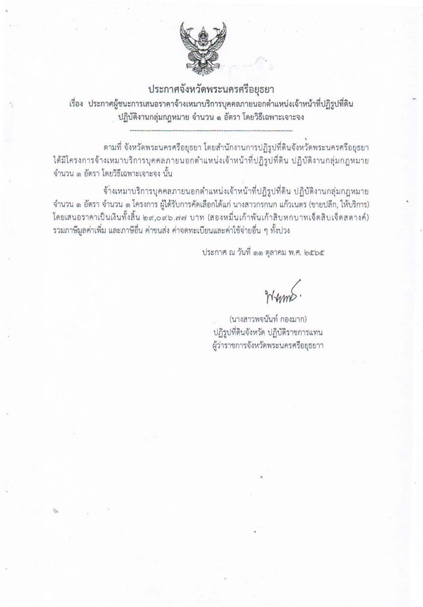ประกาศจังหวัดพระนครศรีอยุธยา เรื่อง ประกาศผู้ชนะการเสนอราคาจ้างเหมาบริการบุคคลภายนอกตำแหน่งเจ้าหน้าที่ปฏิรูปที่ดิน ปฏิบัติงานกลุ่มกฎหมาย จำนวน 1 อัตรา โดยวิธีเฉพาะเจาะจง