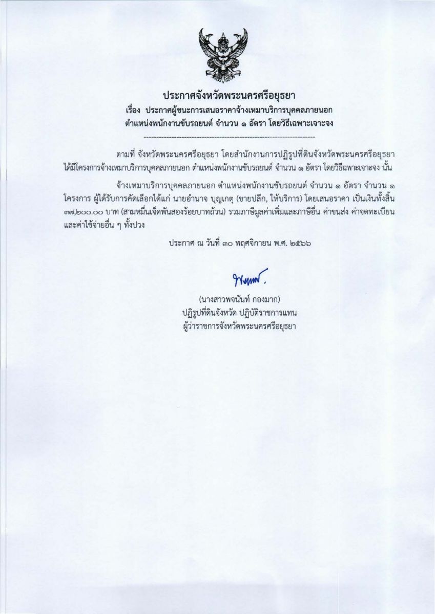 ประกาศจังหวัดพระนครศรีอยุธยา เรื่อง ประกาศผู้ชนะการเสนอราคาจ้างเหมาบริการบุคคลภายนอก ตำแหน่งพนักงานขับรถยนต์ จำนวน 1 อัตรา โดยวิธีเฉพาะเจาะจง
