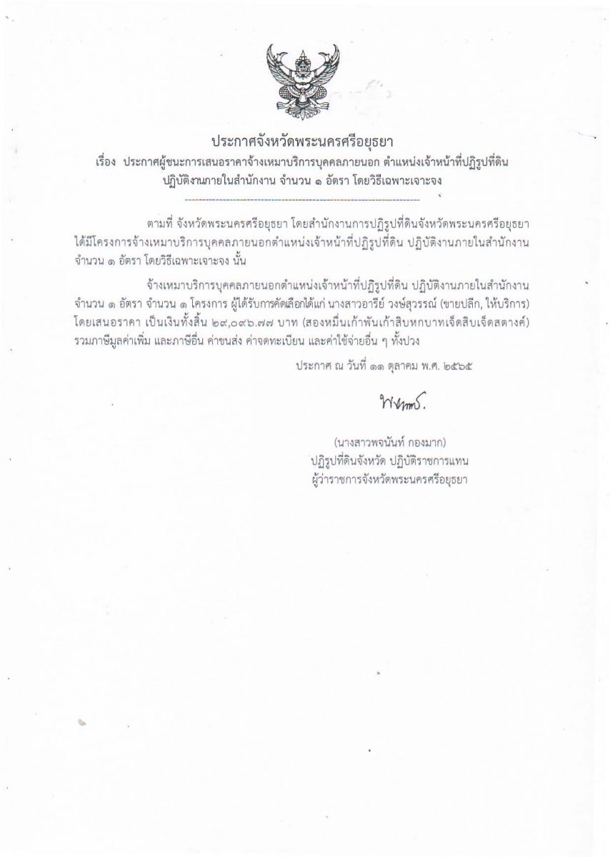 ประกาศจังหวัดพระนครศรีอยุธยา เรื่อง ประกาศผู้ชนะการเสนอราคาจ้างเหมาบริการบุคคลภายนอก ตำแหน่งเจ้าหน้าที่ปฏิรูปที่ดิน ปฏิบัติงานภายในสำนักงาน จำนวน 1 อัตรา โดยวิธีเฉพาะเจาะจง