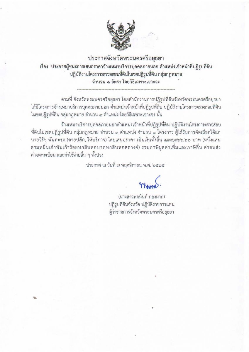 ประกาศจังหวัดพระนครศรีอยุธยา เรื่อง ประกาศผู้ชนะการเสนอราคาจ้างเหมาบริการบุคคลภายนอก ตำแหน่งเจ้าหน้าที่ปฏิรูปที่ดิน ปฏิบัติงานโครงการตรวจสอบที่ดินในเขตปฏิรูปที่ดิน กลุ่มกฎหมาย จำนวน 1 อัตรา โดยวิธีเฉพาะเจาะจง