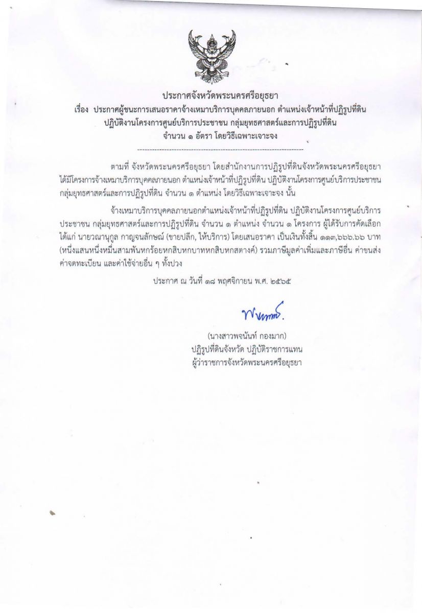 ประกาศจังหวัดพระนครศรีอยุธยา เรื่อง ประกาศผู้ชนะการเสนอราคาจ้างเหมาบริการบุคคลภายนอก ตำแหน่งเจ้าหน้าที่ปฏิรูปที่ดิน ปฏิบัติงานโครงการศูนย์บริการประชาชน กลุ่มยุทธศาสตร์และการปฏิรูปที่ดิน จำนวน 1 อัตรา โดยวิธีเฉพาะเจาะจง