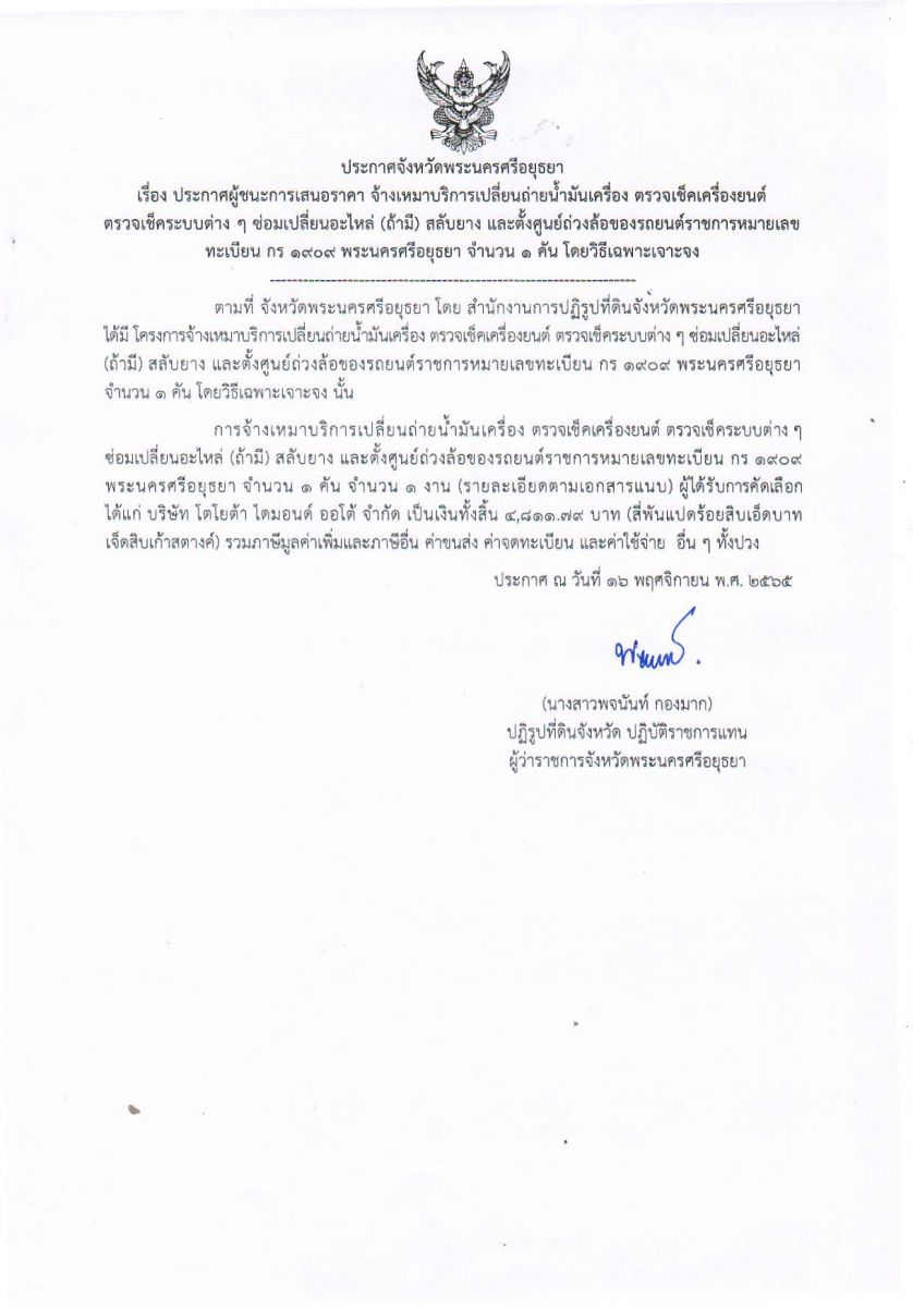 ประกาศจังหวัดพระนครศรีอยุธยา เรื่อง ประกาศผู้ชนะการเสนอราคาจ้างเหมาบริการเปลี่ยนถ่ายน้ำมันเครื่อง ตรวจเช็คเครื่องยนต์ ตรวจเช็คระบบต่าง ๆ ซ่อมเปลี่ยนอะไหล่ (ถ้ามี) สลับยาง และตั้งศูนยถ่วงล้อของรถยนต์ราชการหมายเลขทะเบียน กร 1909 พระนครศรีอยุธยา จำนวน 1 คัน โดยวิธีเฉพาะเจาะจง
