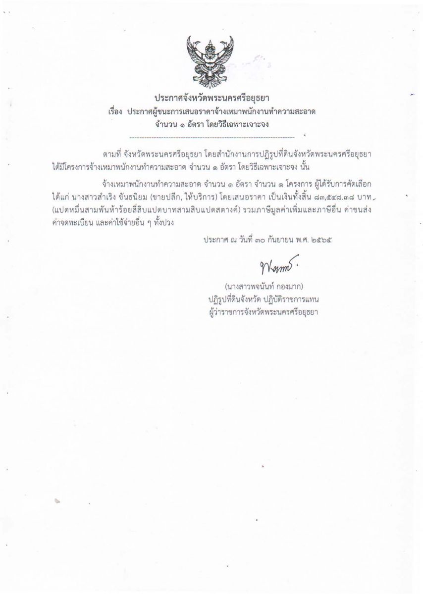ประกาศจังหวัดพระนครศรีอยุธยา เรื่อง ประกาศผู้ชนะการเสนอราคาจ้างเหมาพนักงานทำความสะอาด จำนวน 1 อัตรา โดยวิธีเฉพาะเจาะจง