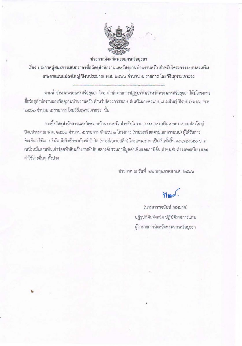 ประกาศจังหวัดพระนครศรีอยุธยา เรื่อง ประกาศผู้ชนะการเสนอราคาซื้อวัสดุสำนักงานและวัสดุงานบ้านงานครัว สำหรับโครงการระบบส่งเสริมเกษตรแบบแปลงใหญ่ ปีงบประมาณ พ.ศ. 2566 จำนวน 5 รายการ โดยวิธีเฉพาะเจาะจง