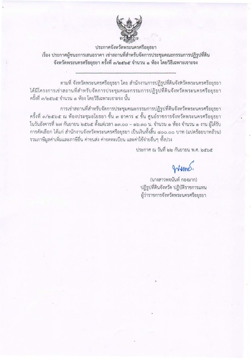 ประกาศจังหวัดพระนครศรีอยุธยา เรื่อง ประกาศผู้ชนะการเสนอราคาเช่าสถานที่สำหรับจัดการประชุมคณะกรรมการปฏิรูปที่ดินจังหวัดพระนครศรีอยุธยา ครั้งที่ 3/2565 จำนวน 1 ห้อง โดยวิธีเฉพาะเจาะจง