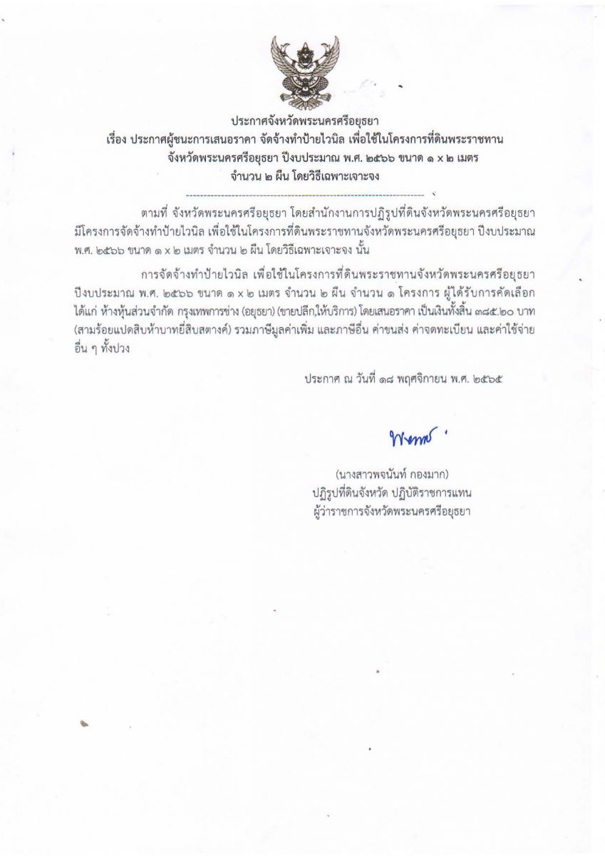 ประกาศจังหวัดพระนครศรีอยุธยา เรื่อง ประกาศผู้ชนะการเสนอราคา จัดจ้างทำป้ายไวนิล เพื่อใช้ในโครงการที่ดินพระราชทาน จังหวัดพระนครศรีอยุธยา ปีงบประมาณ พ.ศ. 2566 ขนาด 1 x 2 เมตร จำนวน 2 ผืน โดยวิธีเฉพาะเจาะจง