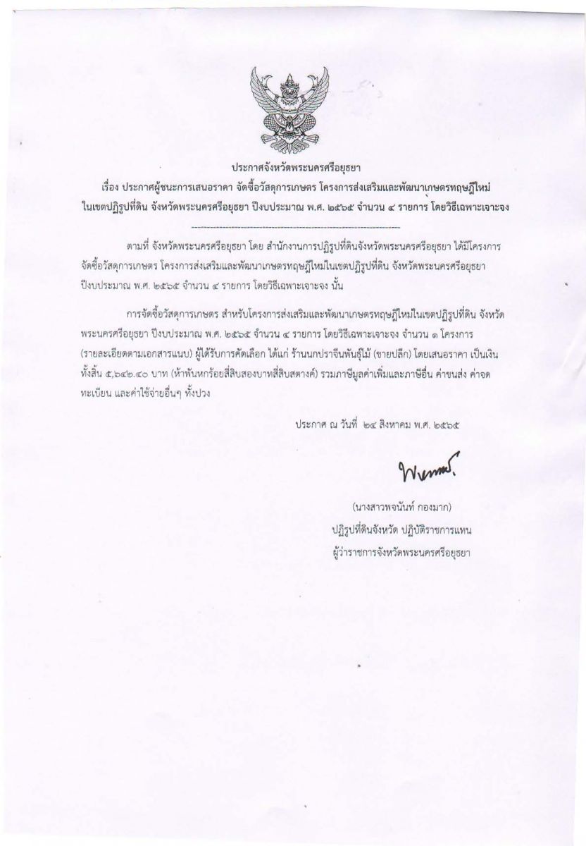 ประกาศจังหวัดพระนครศรีอยุธยา เรื่อง ประกาศผู้ชนะการเสนอราคา จัดซื้อวัสดุการเกษตร โครงการส่งเสริมและพัฒนาเกษตรทฤษฎีใหม่ในเขตปฏิรูปที่ดิน จังหวัดพระนครศรีอยุธยา ปีงบประมาณ พ.ศ. 2565 จำนวน 4 รายการ โดยวิธีเฉพาะเจาะจง