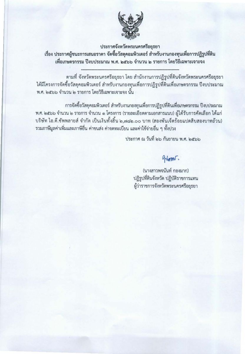 ประกาศจังหวัดพระนครศรีอยุธยา เรื่อง ประกาศผู้ชนะการเสนอราคา จัดซื้อวัสดุคอมพิวเตอร์ สำหรับงานกองทุนเพื่อการปฏิรูปที่ดินเพื่อเกษตรกรรม ปีงบประมาณ พ.ศ. 2566 จำนวน 2 รายการ โดยวิธีเฉพาะเจาะจง