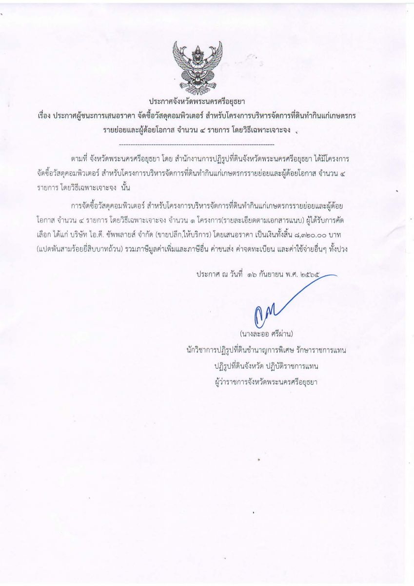ประกาศจังหวัดพระนครศรีอยุธยา เรื่อง ประกาศผู้ชนะการเสนอราคา จัดซื้อวัสดุคอมพิวเตอร์ สำหรับโครงการบริหารจัดการที่ดินทำกินแก่เกษตรกรรายย่อยและผู้ด้อยโอกาส จำนวน ๔ รายการ โดยวิธีเฉพาะเจาะจง