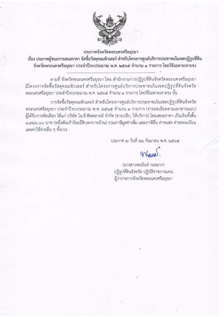 ประกาศจังหวัดพระนครศรีอยุธยา เรื่อง ประกาศผู้ชนะการเสนอราคา จัดซื้อวัสดุคอมพิวเตอร์ สำหรับโครงการศูนย์บริการประชาชนในเขตปฏิรูปที่ดิน จังหวัดพระนครศรีอยุธยา ประจำปีงบประมาณ พ.ศ. 2565 จำนวน 1 รายการ โดยวิธีเฉพาะเจาะจง