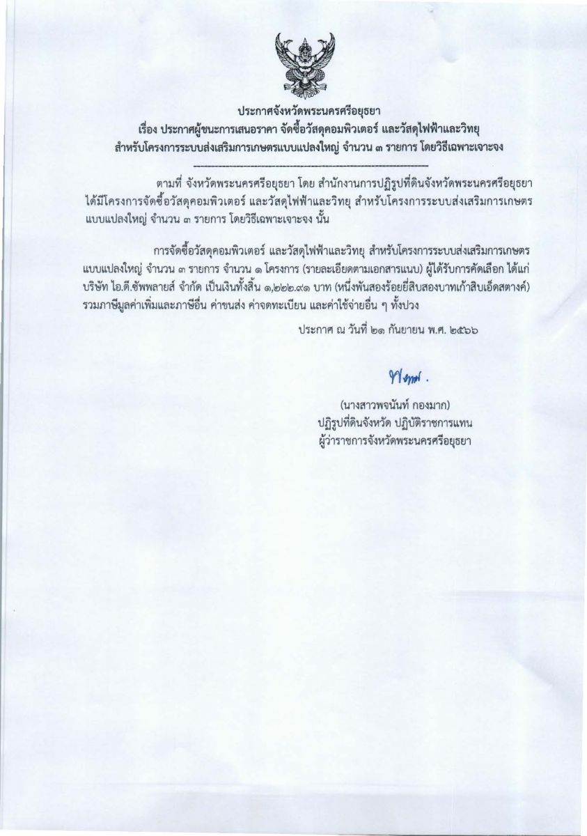 ประกาศจังหวัดพระนครศรีอยุธยา เรื่อง ประกาศผู้ชนะการเสนอราคา จัดซื้อวัสดุคอมพิวเตอร์ และวัสดุไฟฟ้าและวิทยุสำหรับโครงการระบบส่งเสริมการเกษตรแบบแปลงใหญ่ จำนวน 3 รายการ โดยวิธีเฉพาะเจาะจง