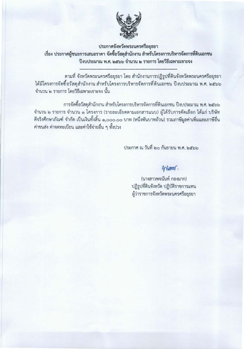 ประกาศจังหวัดพระนครศรีอยุธยา เรื่อง ประกาศผู้ชนะการเสนอราคา จัดซื้อวัสดุสำนักงาน สำหรับโครงการบริหารจัดการที่ดินเอกชน ปีงบประมาณ พ.ศ. 2566 จำนวน 2 รายการ โดยวิธีเฉพาะเจาะจง