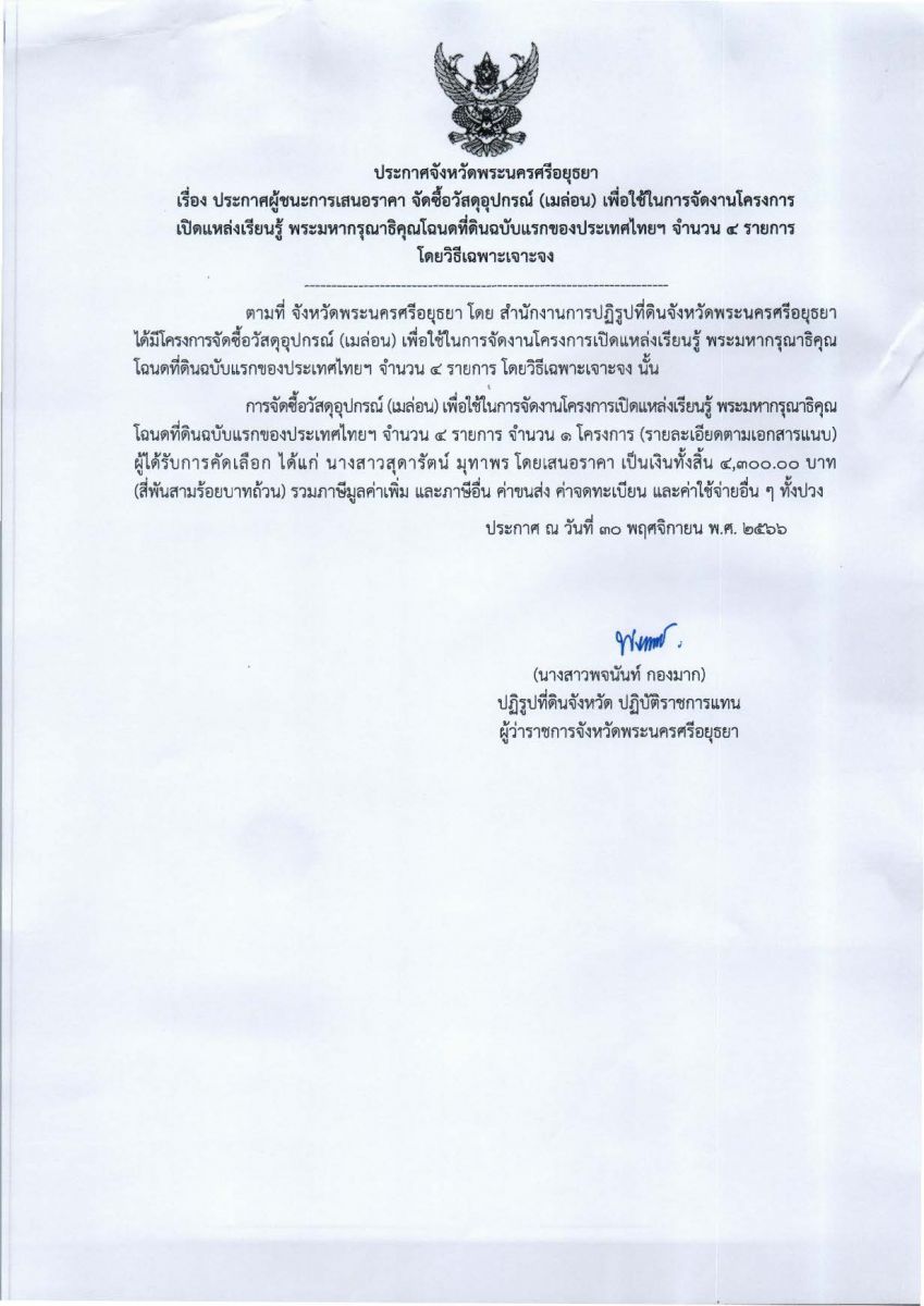 ประกาศจังหวัดพระนครศรีอยุธยา เรื่อง ประกาศผู้ชนะการเสนอราคา จัดซื้อวัสดุอุปกรณ์ (เมล่อน) เพื่อใช้ในการจัดงานโครงการเปิดแหล่งเรียนรู้พระมหากรุณาธิคุณโฉนดที่ดินฉบับแรกของประเทศไทยฯ จำนวน 4 รายการ โดยวิธีเฉพาะเจาะจง