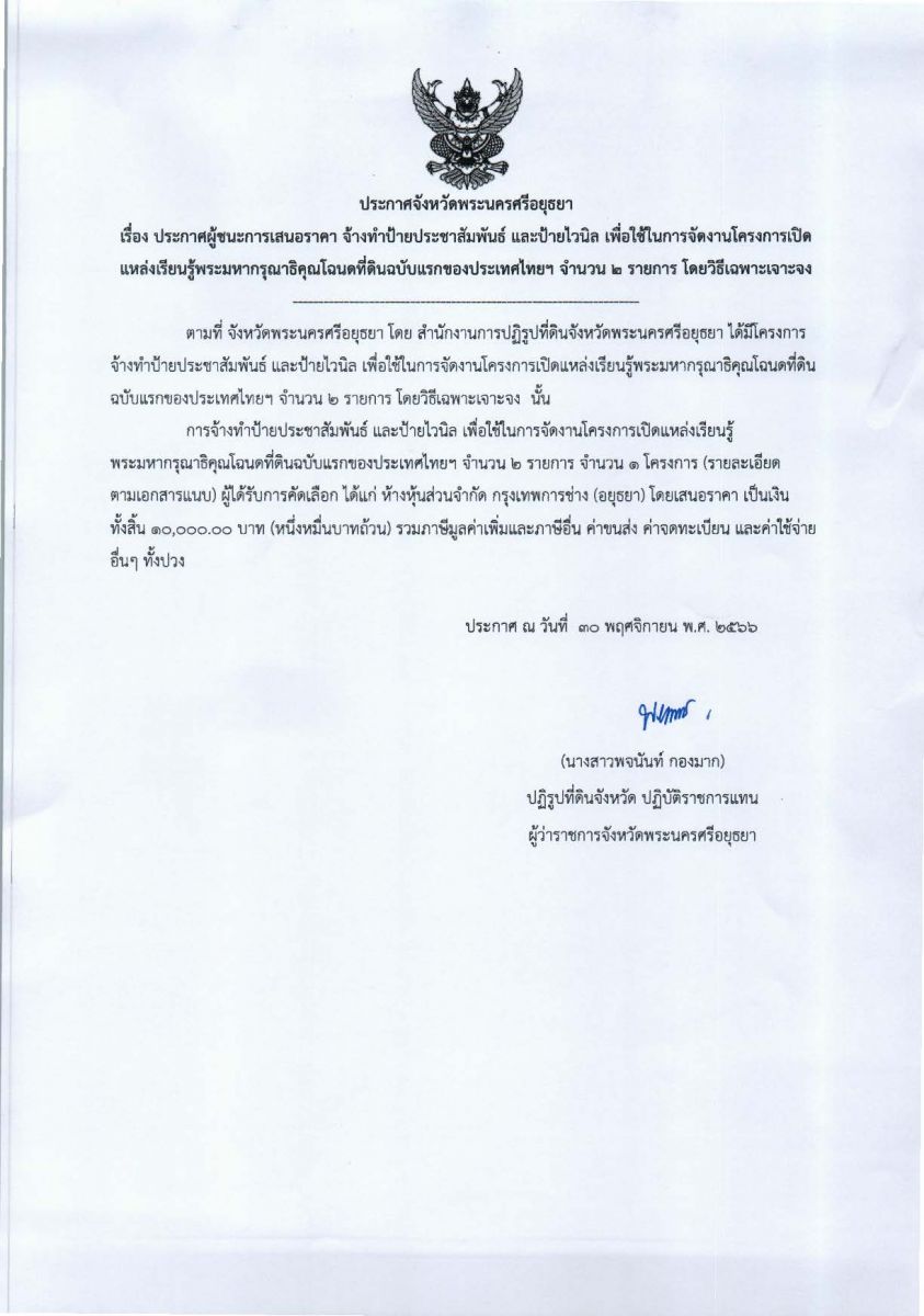 ประกาศจังหวัดพระนครศรีอยุธยา เรื่อง ประกาศผู้ชนะการเสนอราคา จ้างทำป้ายประชาสัมพันธ์ และป้ายไวนิล เพื่อใช้ในการจัดงานโครงการเปิดแหล่งเรียนรู้พระมหากรุณาธิคุณโฉนดที่ดินฉบับแรกของประเทศไทยฯ จำนวน 2 รายการ โดยวิธีเฉพาะเจาะจง
