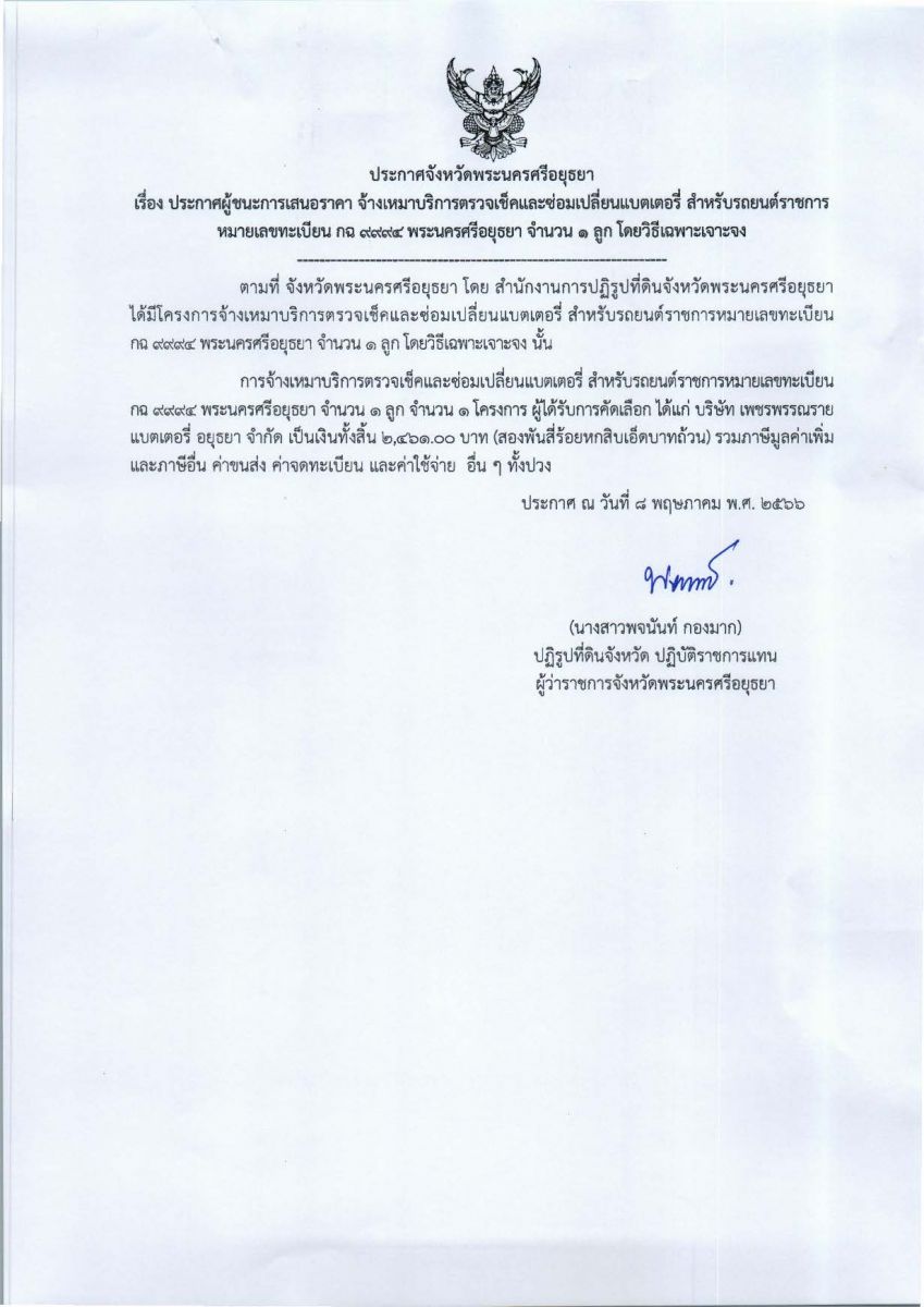 ประกาศจังหวัดพระนครศรีอยุธยา เรื่อง ประกาศผู้ชนะการเสนอราคา จ้างเหมาบริการตรวจเช็คและซ่อมเปลี่ยนแบตเตอรี่ สำหรับรถยนต์ราชการหมายเลขทะเบียน กฉ 9994 พระนครศรีอยุธยา จำนวน 1 ลูก โดยวิธีเฉพาะเจาะจง