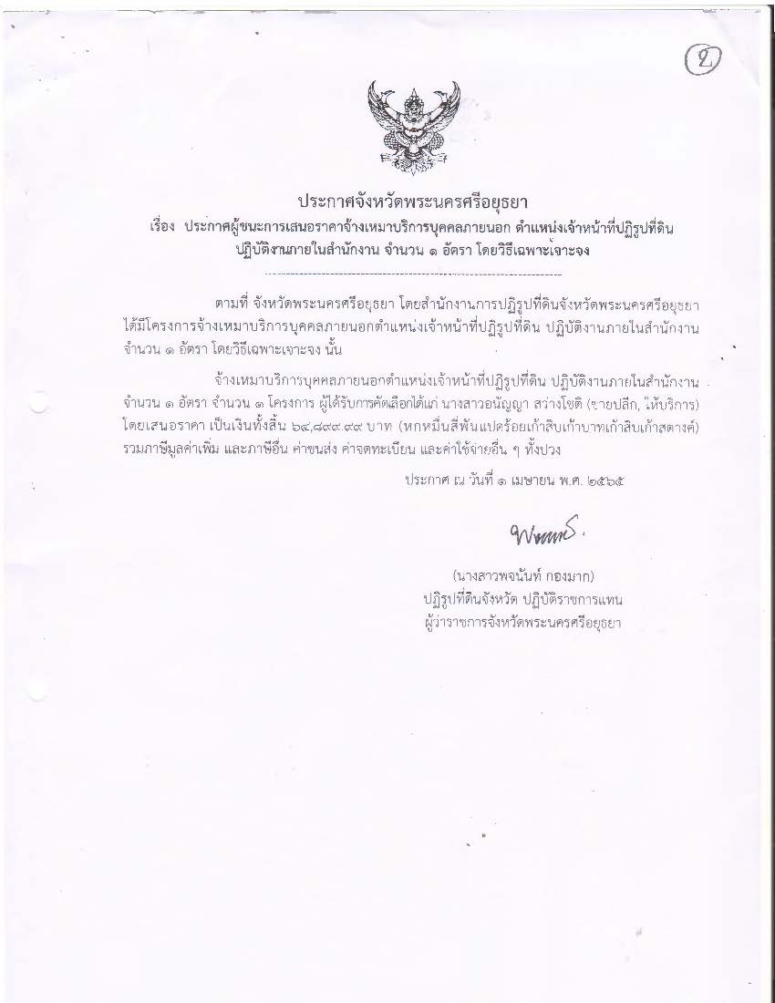 ประกาศจังหวัดพระนครศรีอยุธยา เรื่อง ประกาศผู้ชนะการเสนอราคา จ้างเหมาบริการบุคคลภายนอกตำแหน่งเจ้าหน้าที่ปฏิรูปที่ดิน ปฏิบัติงานภายในสำนักงาน จำนวน 1 อัตรา โดยวิธีเฉพาะเจาะจง