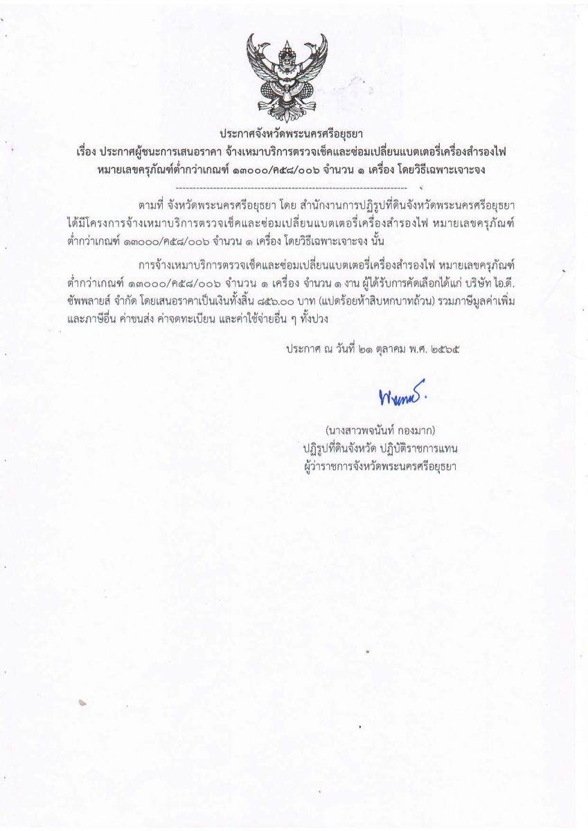 ประกาศจังหวัดพระนครศรีอยุธยา เรื่อง ประกาศผู้ชนะการเสนอราคา จ้างเหมาบริหารตรวจเช็คและว่อมเปลี่ยนแบตเตอรี่เครื่องสำรองไฟ หมายเลขครุภัณฑ์ต่ำเกณฑ์ 13000/ค58/006 จำนวน 1 เครื่อง โดยวิธีเฉพาะเจาะจง