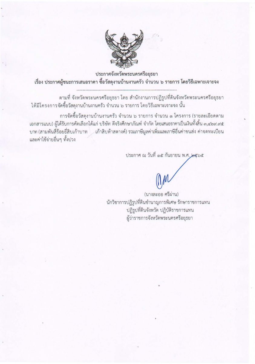 ประกาศจังหวัดพระนครศรีอยุธยา เรื่อง ประกาศผู้ชนะการเสนอราคา ซื้อวัสดุงานบ้านงานครัว จำนวน 6 รายการ โดยวิธีเฉพาะเจาะจง