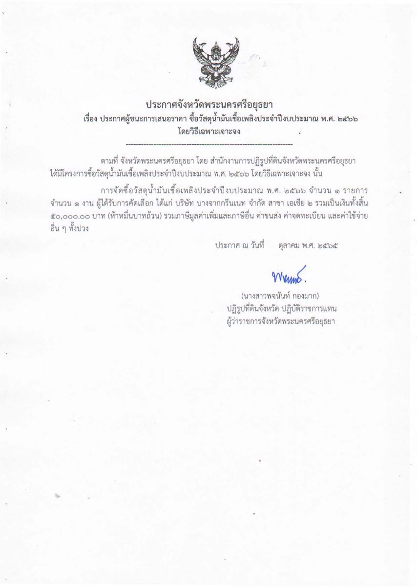 ประกาศจังหวัดพระนครศรีอยุธยา เรื่อง ประกาศผู้ชนะการเสนอราคา ซื้อวัสดุน้ำมันเชื้อเพลิง ประจำปีงบประมาณ พ.ศ. 2566 โดยวิธีเฉพาะเจาะจง