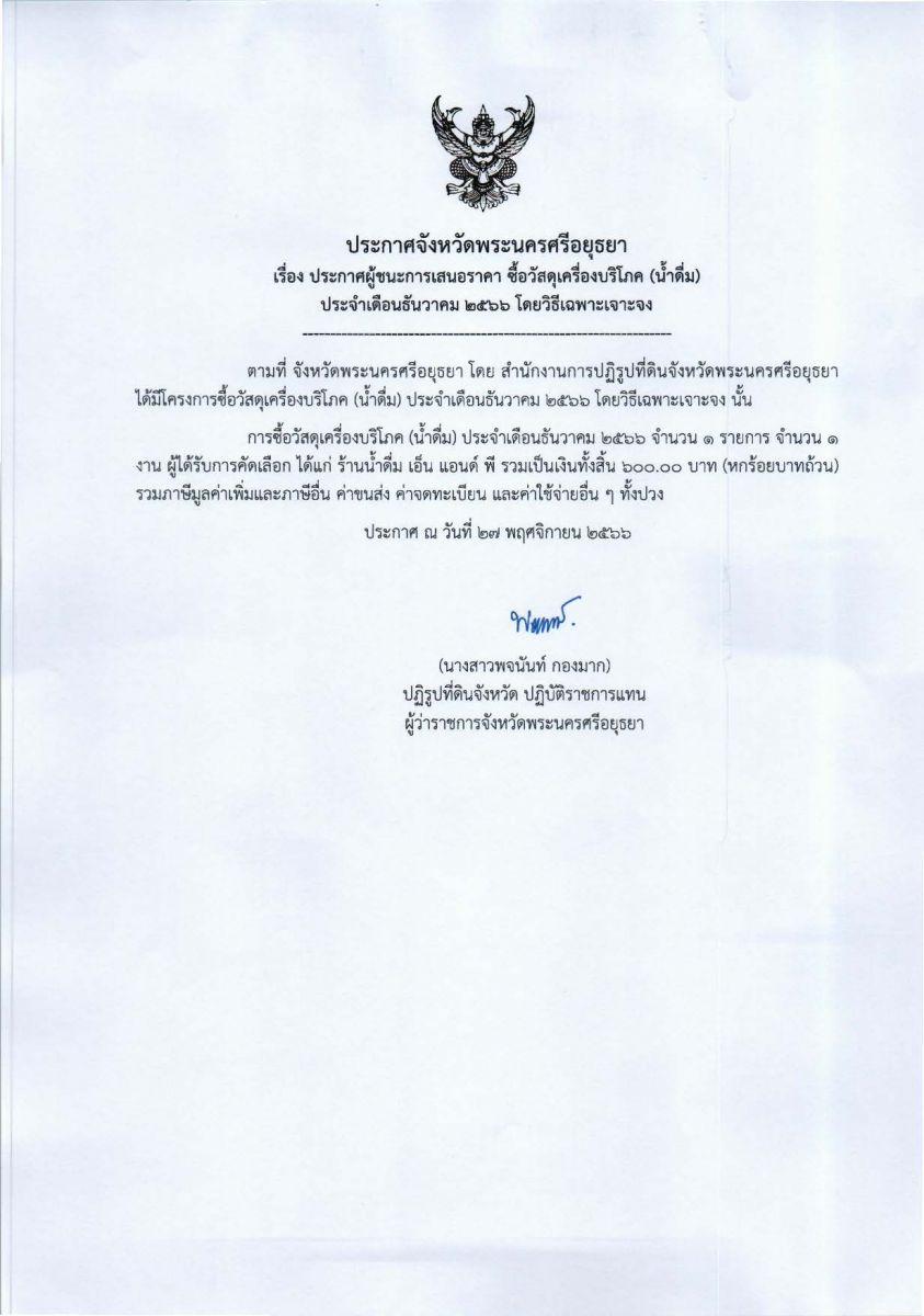 ประกาศจังหวัดพระนครศรีอยุธยา เรื่อง ประกาศผู้ชนะการเสนอราคา ซื้อวัสดุเครื่องบริโภค (น้ำดื่ม) ประจำเดือนธันวาคม 2566 โดยวิธีเฉพาะเจาะจง