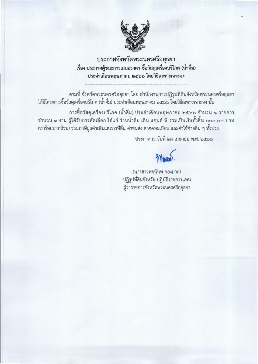 ประกาศจังหวัดพระนครศรีอยุธยา เรื่อง ประกาศผู้ชนะการเสนอราคา ซื้อวัสดุเครื่องบริโภค (น้ำดื่ม) ประจำเดือนพฤษภาคม 2566 โดยวิธีดฉพาะเจาะจง