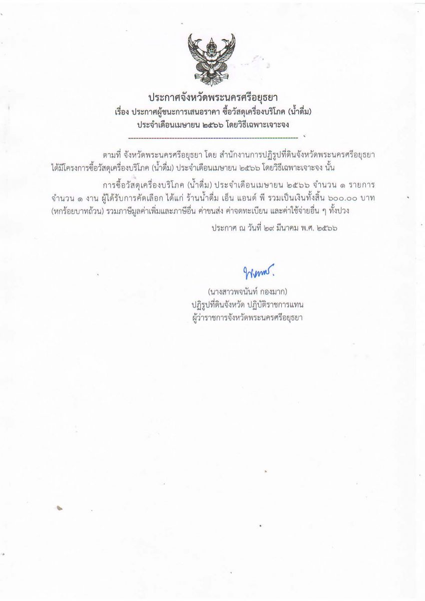 ประกาศจังหวัดพระนครศรีอยุธยา เรื่อง ประกาศผู้ชนะการเสนอราคา ซื้อวัสดุเครื่องบริโภค (น้ำดื่ม) ประจำเดือนเมษายน 2566 โดยวิธีเฉพาะเจาะจง
