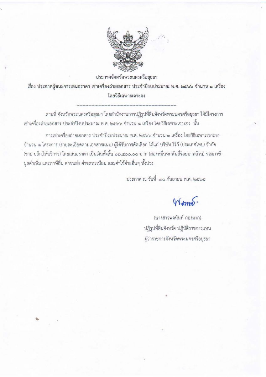 ประกาศจังหวัดพระนครศรีอยุธยา เรื่อง ประกาศผู้ชนะการเสนอราคา เช่าเครื่องถ่ายเอกสาร ประจำปีงบประมาณ พ.ศ. 2566 จำนวน 1 เครื่อง โดยวิธีเฉพาะเจาะจง