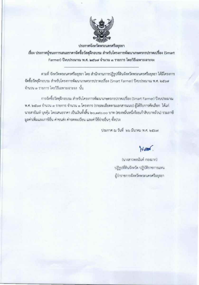 ประกาศจังหวัดพระนครศรีอยุธยา เรื่อง ประกาศเสนอราคา จัดซื้อวัสดุฝึกอบรม สำหรับโครงการพัฒนาเกษตรกรปราดเปรื่อง (Smart Farmer) ปีงบประมาณ พ.ศ. 2567 จำนวน 3 รายการ โดยวิธีเฉพาะเจาะจง