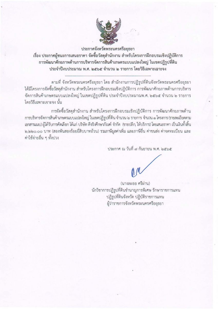 ประกาศจังหวัดพระนครศรีอยุธยา เรื่ิอง ประกาศผู้ชนะการเสนอราคาจัดซื้อวัสดุสำนักงาน สำหรับโครงการฝึกอบรมเชิงปฏิบัติการ การพัฒนาศักยภาพด้านการบริหารจัดการสินค้าเกษตรแบบแปลงใหญ่ในเขตปฏิรูปที่ดิน ประจำปีงบประมาณ พ.ศ. 2565 จำนวน 2 รายการ โดยวิธีเฉพาะเจาะจง