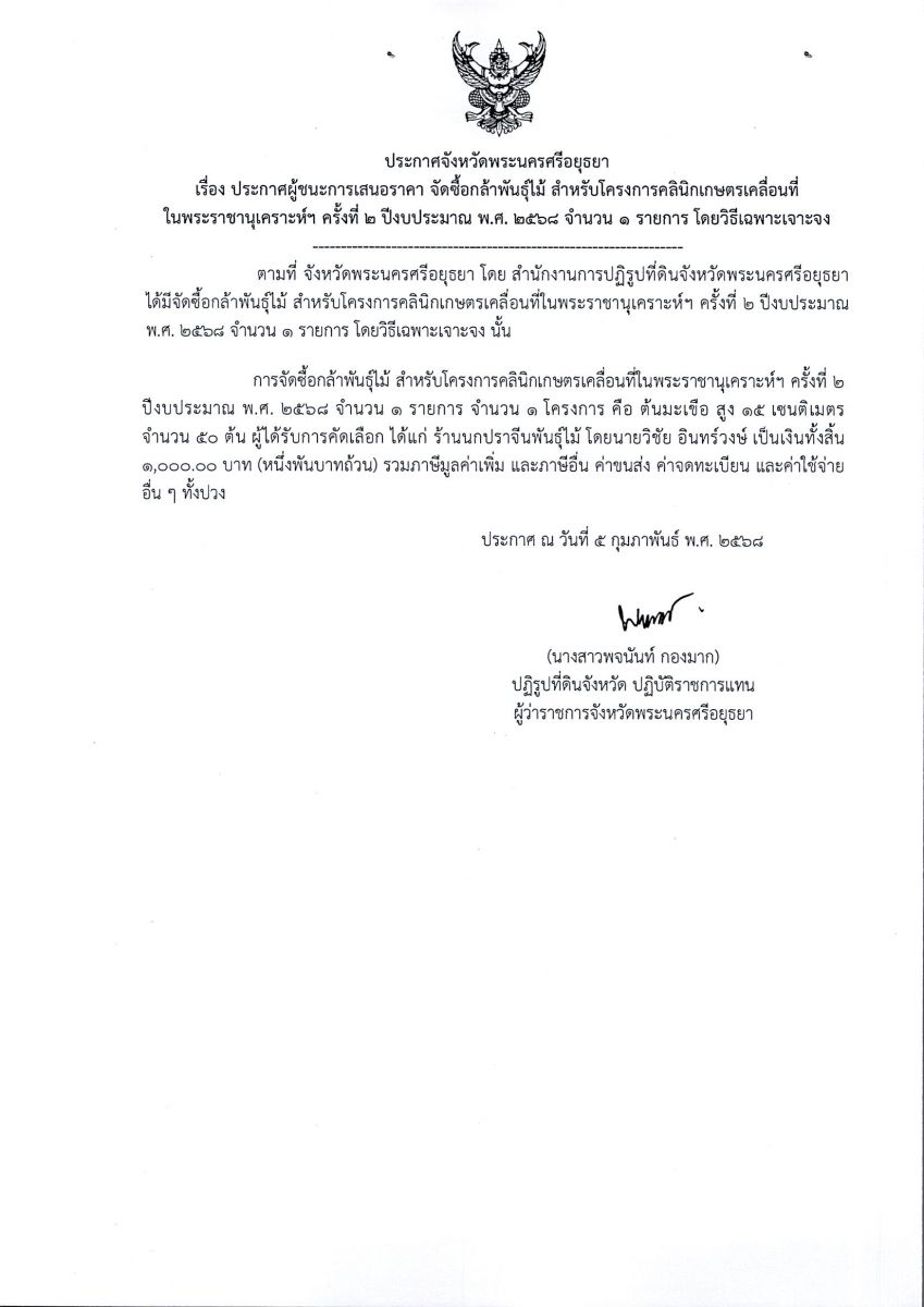 ประกาศผู้ชนะการเสนอราคา จัดซื้อกล้าพันธุ์ไม้ สำหรับโครงการคลินิกเกษตรเคลื่อนที่ในพระราชานุเคราะห์ฯ ครั้งที่ 2 ปีงบประมาณ พ.ศ.2568 จำนวน 1 รายการ โดยวิธีเฉพาะเจาะจง