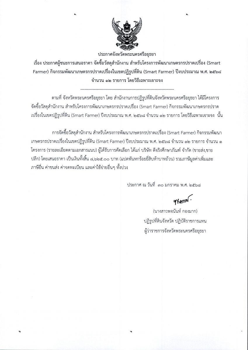 ประกาศผู้ชนะการเสนอราคา จัดซื้อวัสดุสำนักงาน สำหรับโครงการพัฒนาเกษตรกรปราดเปรื่อง (Smart Farmer) กิจกรรมพัฒนาเกษตรกรปราดเปรื่องในเขตปฏิรูปที่ดิน (Smart Farmer) ปีงบประมาณ พ.ศ. 2568 จำนวน 12 รายการ โดยวิธีเฉพาะเจาะจง