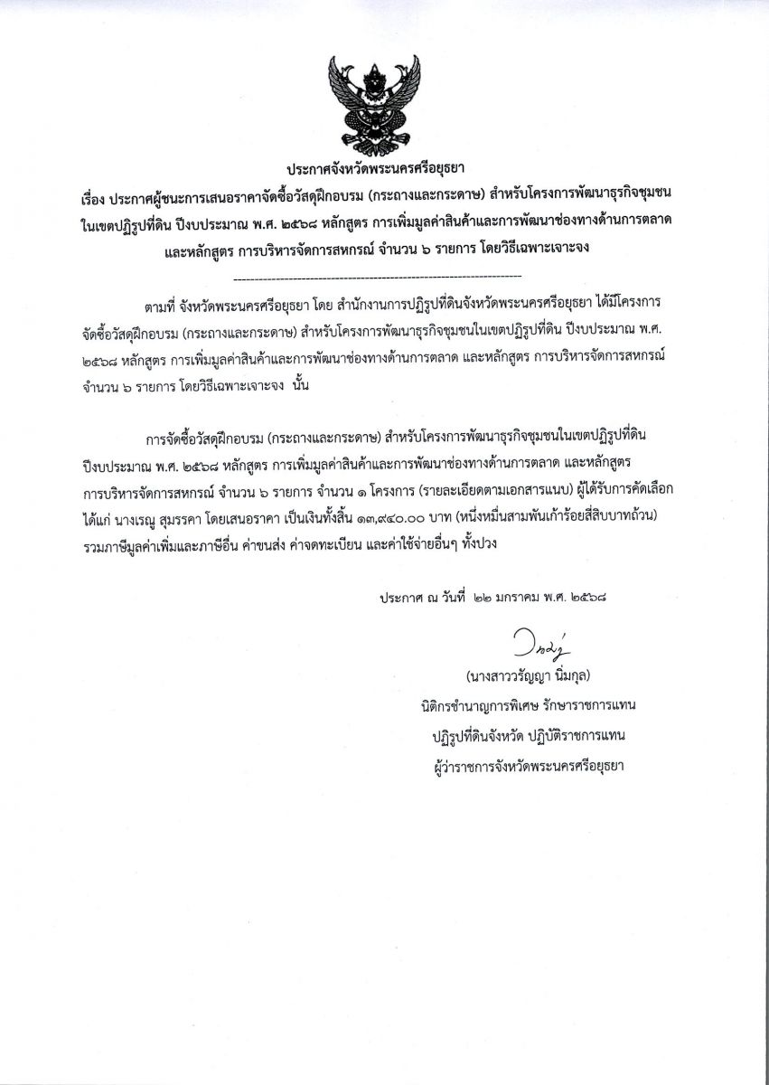 ประกาศผู้ชนะเสนอราคาจัดซื้อวัสดุฝึกอบรม (กระถางและกระดาษ) สำหรับโครงการพัฒนาธุรกิจชุมชนในเขตปฏิรูปที่ดิน ปีงบประมาณ พ.ศ.2568 หลักสูตร การเพิ่มมูลค่าสินค้าและการพัฒนาช่องทางด้านการตลาดและหลักสูตร การบริหารจัดการสหกรณ์ จำนวน 6 รายการ โดยวิธีเฉพาะเจาะจง