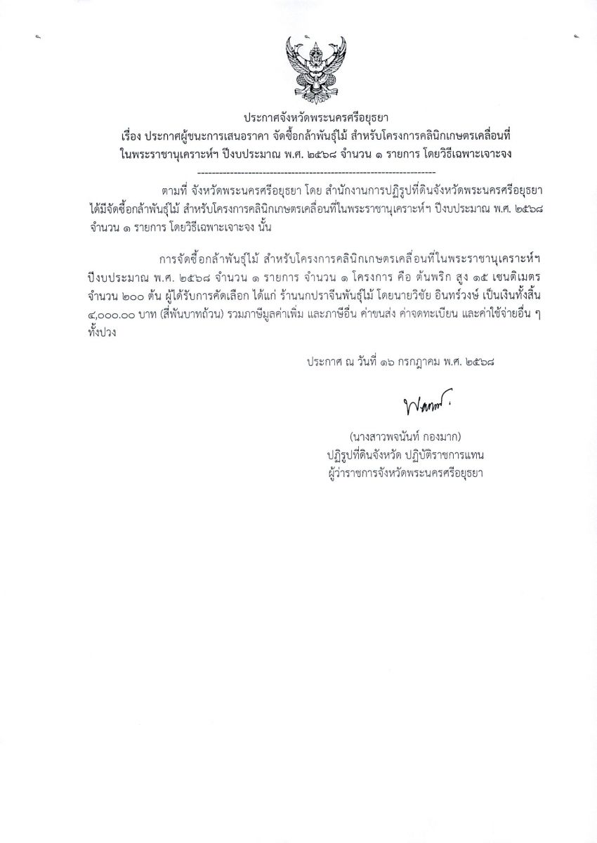 ประกาศผู้ชนะการเสนอราคา จัดซื้อกล้าพันธุ์ไม้ สำหรับโครงการคลินิกเกษตรเคลื่อนที่ในพระราชานุเคราะห์ฯ ปีงบประมาณ พ.ศ. 2568 จำนวน 1 รายการ โดยวิธีเฉพาะเจาะจง