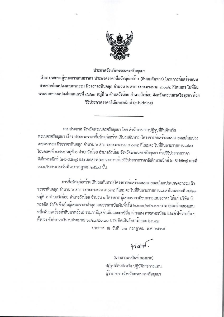 ประกาศผู้ชนะการเสนอราคา ประกวดราคาซื้อวัสดุก่อสร้าง (ดินถมคันทาง) โครงการก่อสร้างถนนสายซอยในแปลงเกษตรกรรม ผิวจราจรหินคลุก จำนวน 6 สาย ระยะทางรวม 4.074 กิโลเมตร ในที่ดินพระราชทานแปลงโฉนดเลขที่ 8421 หมู่ที่ 6 ตำบลวังน้อย อำเภอวังน้อย จังหวัดพระนครศรีอยุธยา ด้วยวิธีประกวดราคาอิเล็กทรอนิกส์ (e - bidding)