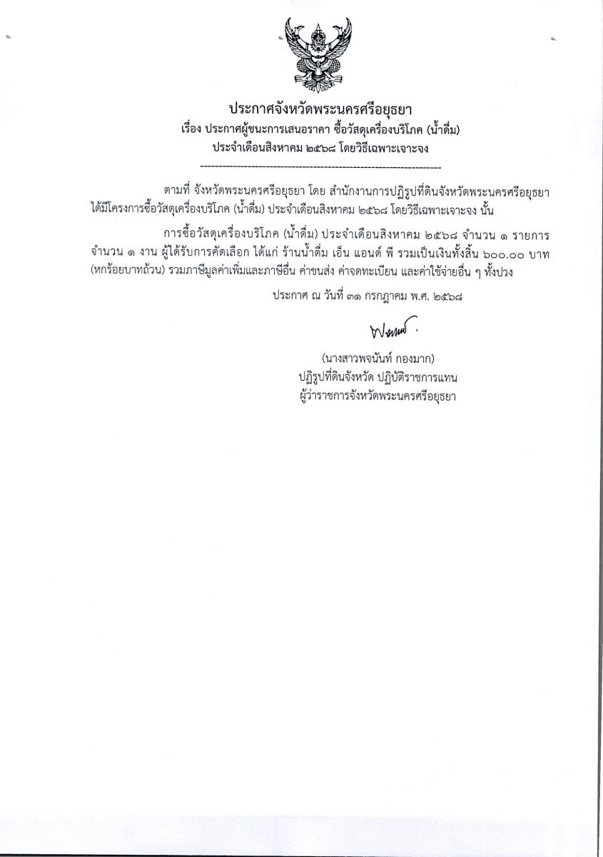 ประกาศผู้ชนะการเสนอราคา ซื้อวัสดุเครื่องบริโภค (น้ำดื่ม) ประจำเดือนสิงหาคม 2568 โดยวิธีเฉพาะเจาะจง