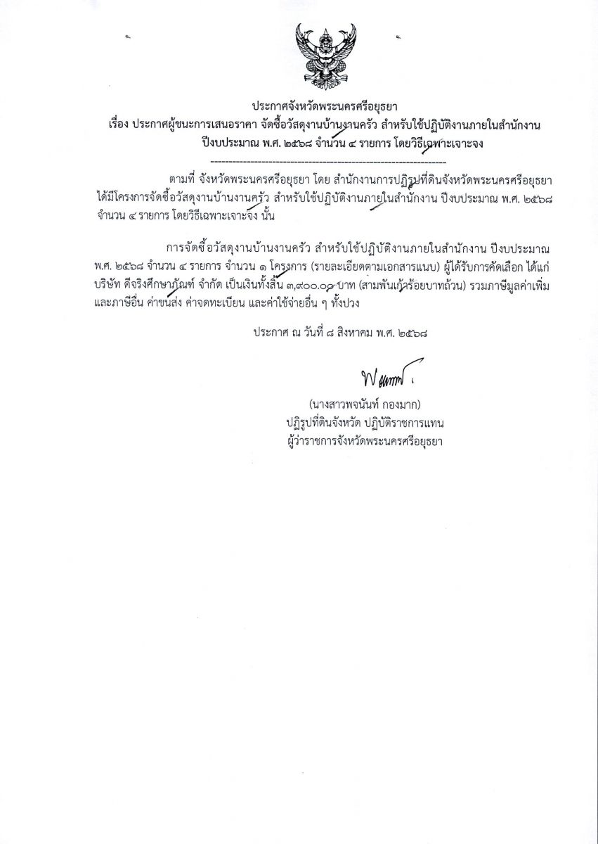 ประกาศผู้ชนะการเสนอราคา จัดซื้อวัสดุงานบ้านงานครัว สำหรับใช้ปฏิบัติงานภายในสำนักงาน ปีงบประมาณ พ.ศ. 2568 จำนวน 4 รายการ โดยวิธีเฉพาะเจาะจง