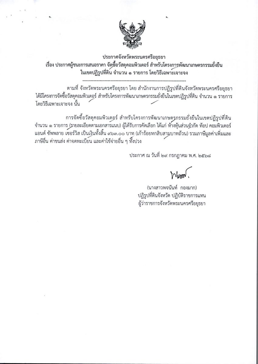 ประกาศผู้ชนะการเสนอราคา จัดซื้อวัสดุสำนักงาน สำหรับโครงการพัฒนาเกษตรกรรมยั่งยืนในเขตปฏิรูปที่ดิน ปีงบประมาณ พ.ศ. 2568 จำนวน 4 รายการ โดยวิธีเฉพาะเจาะจง