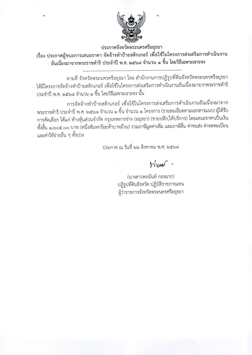 ประกาศผู้ชนะการเสนอราคา จัดจ้างทำป้ายสติกเกอร์ เพื่อใช้ในโครงการส่งเสริมการดำเนินงานอันเนื่องมาจากพระราชดำริ ประจำปี พ.ศ. 2568 จำนวน 1 ชิ้น โดยวิธีเฉพาะเจาะจง