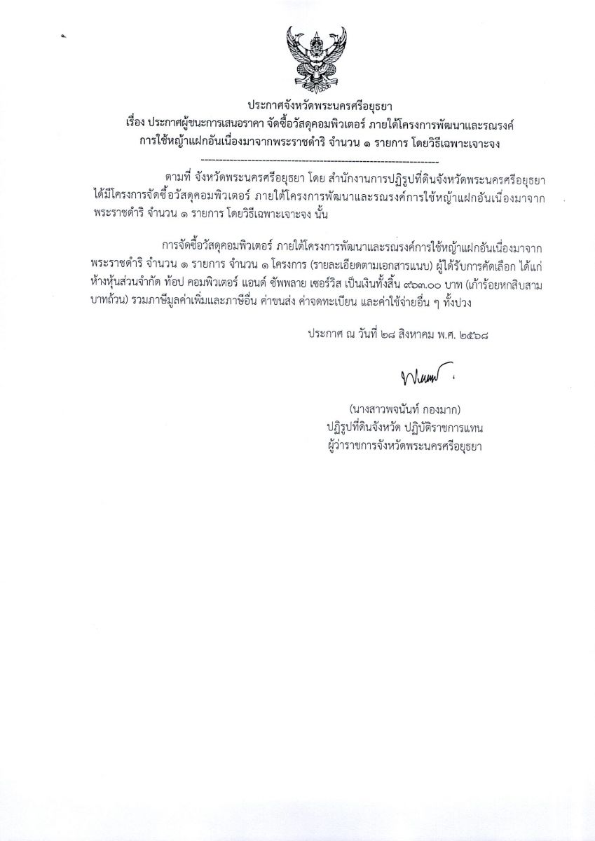 ประกาศผู้ชนะการเสนอราคา จัดซื้อวัสดุคอมพิวเตอร์ ภายใต้โครงการพัฒนาและรณรงค์การใช้หญ้าแฝกอันเนื่องมาจากพระราชดำริ จำนวน 1 รายการ โดยวิธีเฉพาะเจาะจง