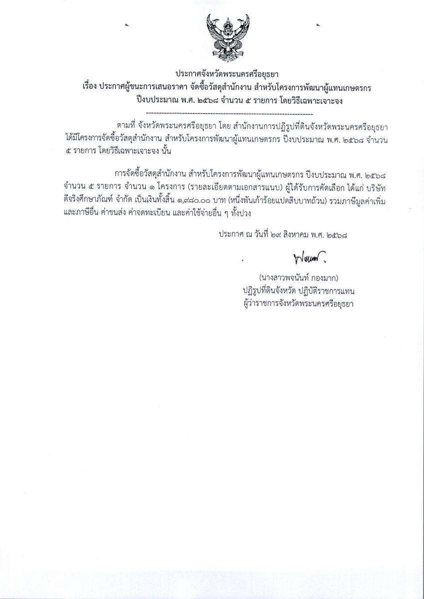 ประกาศผู้ชนะการเสนอราคา จัดซื้อวัสดุสำนักงาน สำหรับโครงการพัฒนาผู้แทนเกษตรกรปีงบประมาณ พ.ศ. 2568 จำนวน 5 รายการ โดยวิธีเฉพาะเจาะจง