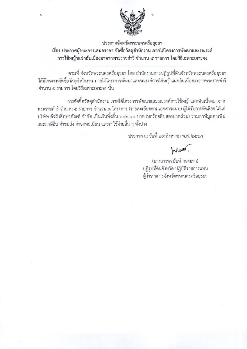 ประกาศผู้ชนะการเสนอราคา จัดซื้อวัสดุสำนักงาน ภายใต้โครงการพัฒนาและรณรงค์การใช้หญ้าแฝกอันเนื่องมาจากพระราชดำริ จำนวน 5 รายการ โดยวิธีเฉพาะเจาะจง