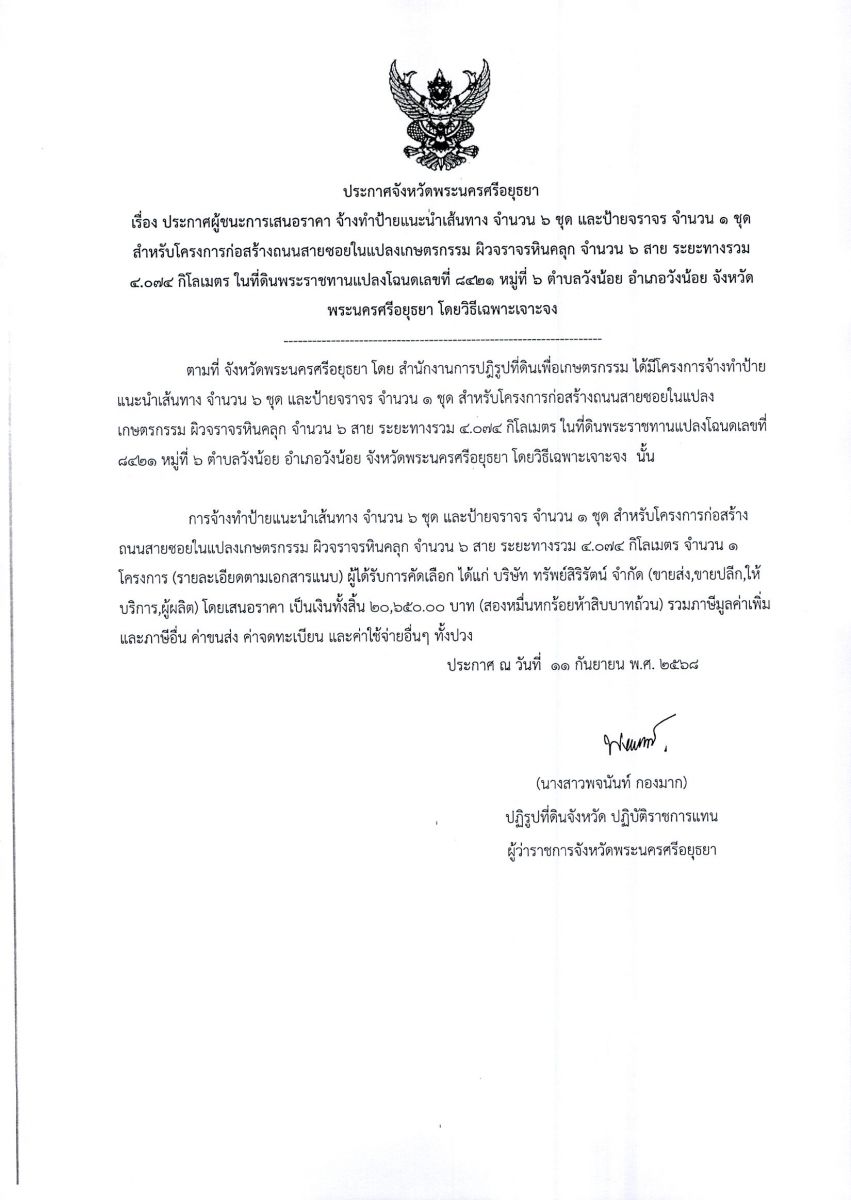 ประกาศผู้ชนะการเสนอราคา จ้างทำป้ายแนะนำเส้นทาง จำนวน 6 ชุด และป้ายจราจร จำนวน 1 ชุด สำหรับโครงการก่อสร้างถนนสายซอยในแปลงเกษตรกรรม ผิวจราจรหินคลุก จำนวน ๖ สาย ระยะทางรวม ๔.๐๗๔ กิโลเมตร ในที่ดินพระราชทานแปลงโฉนดเลขที่ ๘๔๒๑ หมู่ที่ ๖ ตำบลวังน้อย อำเภอวังน้อย จังหวัดพระนครศรีอยุธยา โดยวิธีเฉพาะเจาะจง