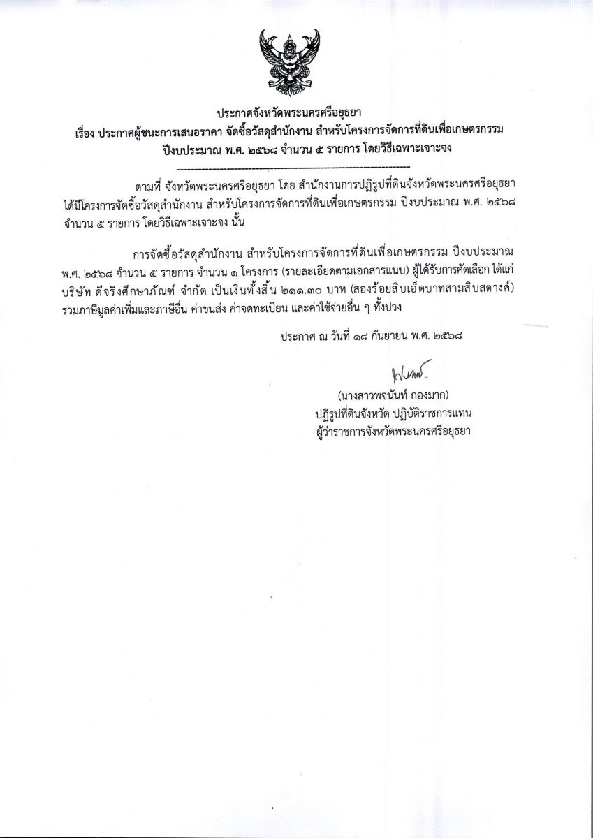 ประกาศผู้ชนะการเสนอราคา จัดซื้อวัสดุสำนักงาน สำหรับโครงการจัดการที่ดินเพื่อเกษตรกรรม ปีงบประมาณ พ.ศ. 2568 จำนวน 5 รายการ โดยวิธีเฉพาะเจาะจง